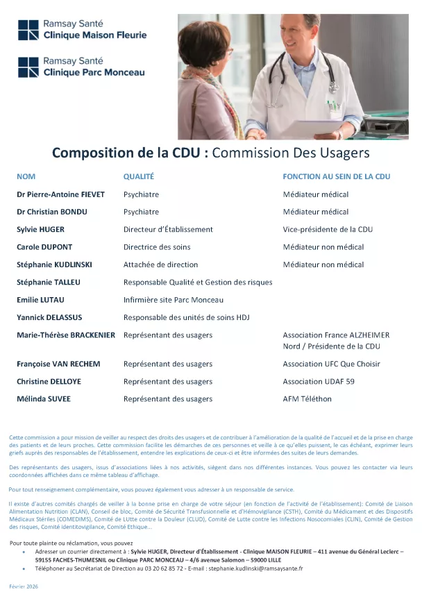 - de deux représentants des usagers, et leurs suppléants, désignés par le directeur général de l'Agence régionale de santé (ARS) que vous pouvez contacter à l’adresse mail suivante : mfpm.ru@ramsaysante.fr